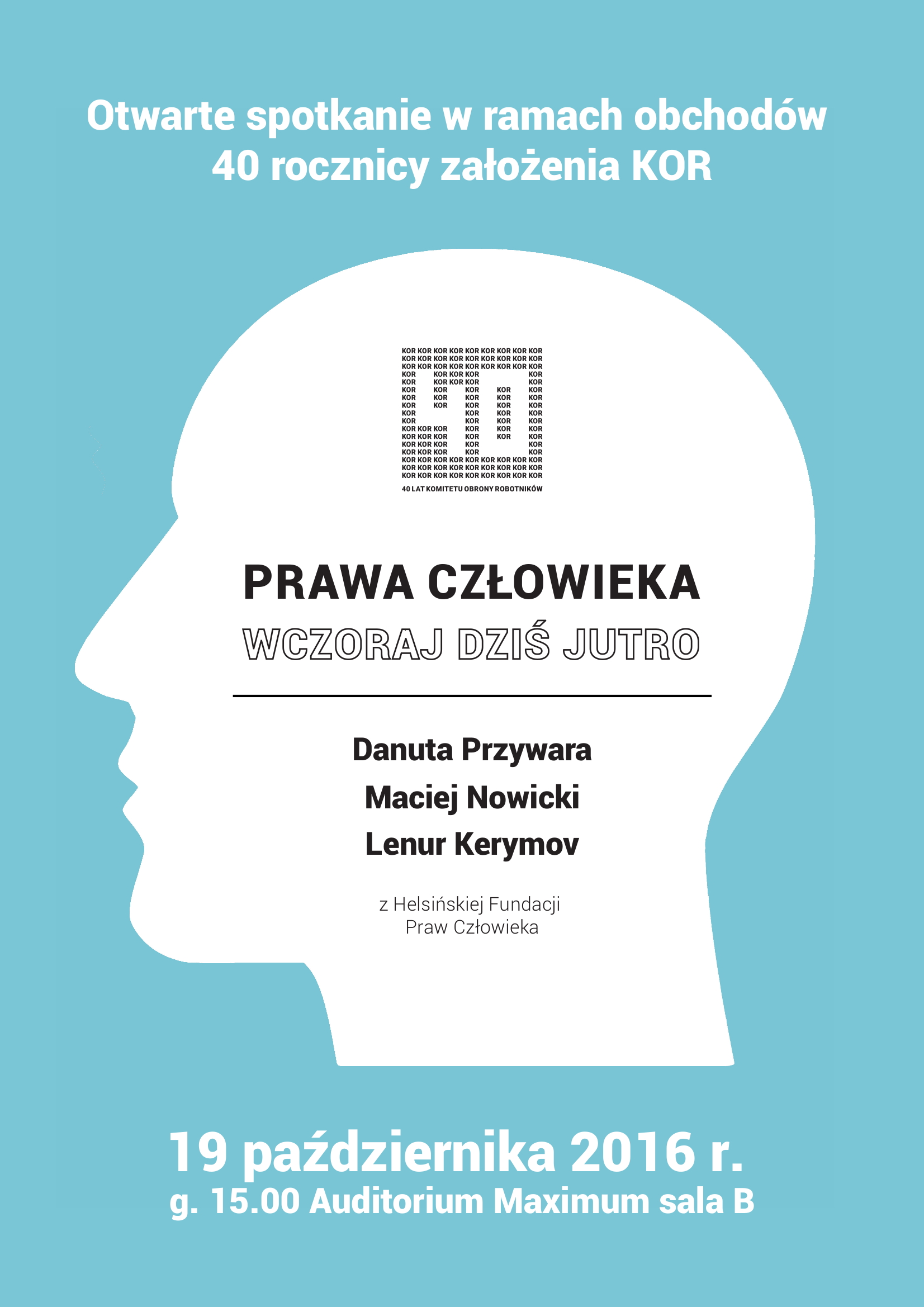 19 października 2016 o godz. 15.00 w Sali B Audytorium Maximum odbędzie się otwarte dla publiczności spotkanie „Prawa człowieka wczoraj, dziś, jutro” z Danutą Przywarą, Lenurem Kerymovem i Maciejem Nowickim z Helsińskiej Fundacji Praw Człowieka.
