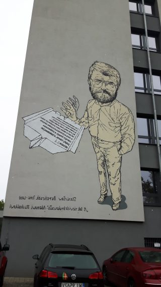 Stanisław Barańczak spogląda z muralu na przechodniów, puszczając papierowy samolot z pierwszą zwrotką dedykowanego Adamowi Michnikowi wiersza „A tak niewiele brakowało”.
