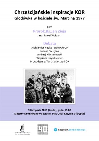 W środę, 9 listopada, o 19.00 w Klasztorze oo. Dominikanów, Plac Ofiar Katynia 1 (krypta), o chrześcijańskich inspiracjach KOR i głodówce w kościele św. Marcina w maju 1977 rozmawiać będą: Joanna Szczęsna, Wojciech Onyszkiewicz, o. Aleksander Hauke-Ligowski i Andrzej Milczanowski. Spotkanie poprowadzi o. Tomasz Dostatni.